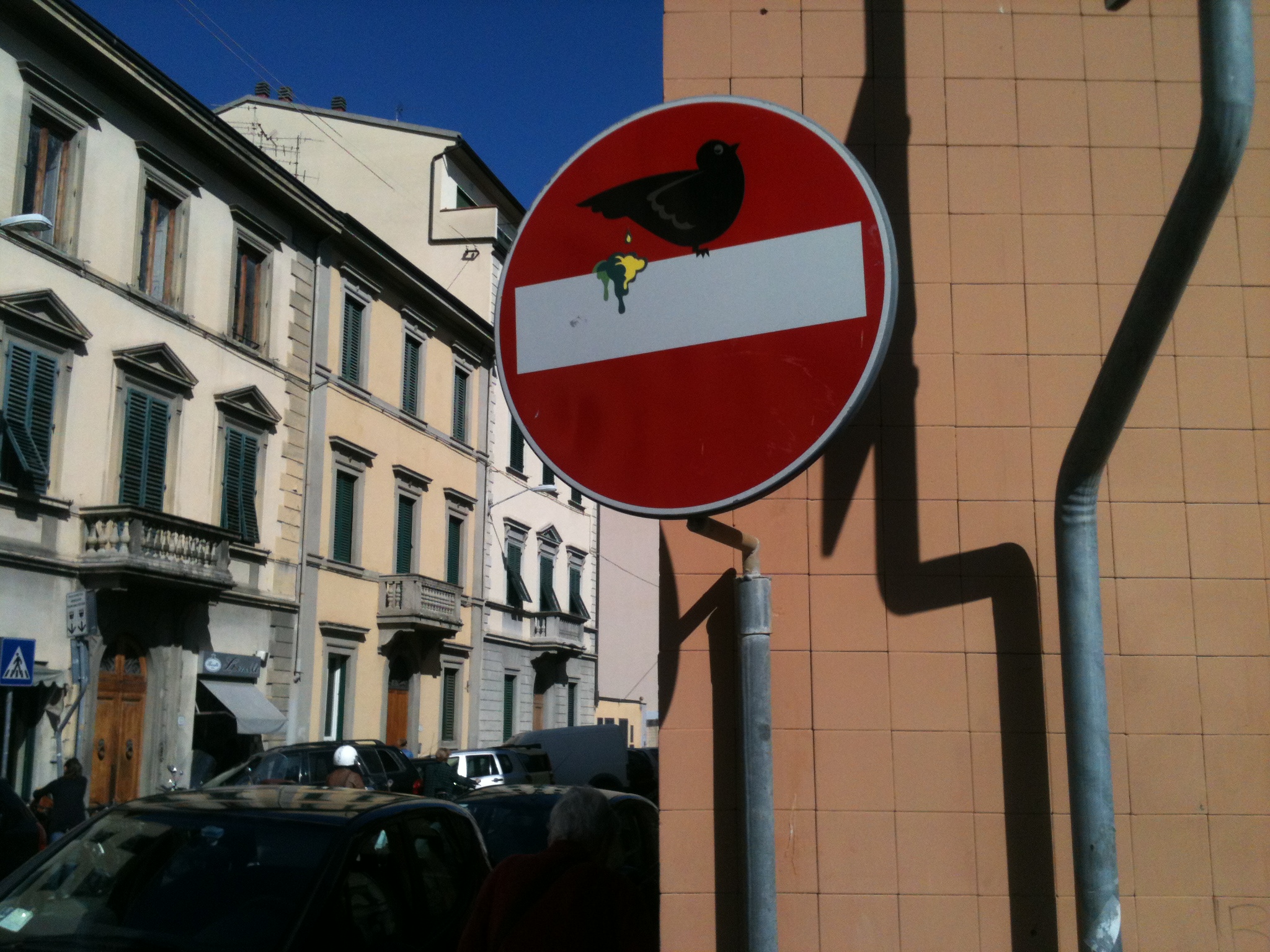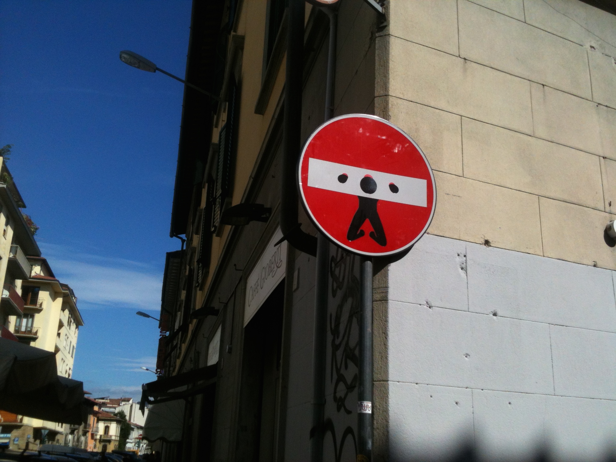 Last year, when I was in Florence, I saw the work of Clet Abraham. He is an artist who alters European traffic signs. He sites various reasons for doing this, many of which are aesthetic in nature, but he also claims these signs speak down to us. The two altered no entry signs shown here seem to point out a refusal to take these signs seriously and to express a feeling of being unwillingly forced into encountering them.